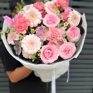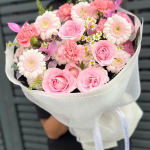 Bó hoa được gói bằng lớp giấy trắng tinh khôi, điểm xuyết cùng ruy băng mềm mại, mang đến tổng thể thanh lịch và hiện đại – một món quà hoàn hảo để gửi gắm những lời yêu thương chân thành.